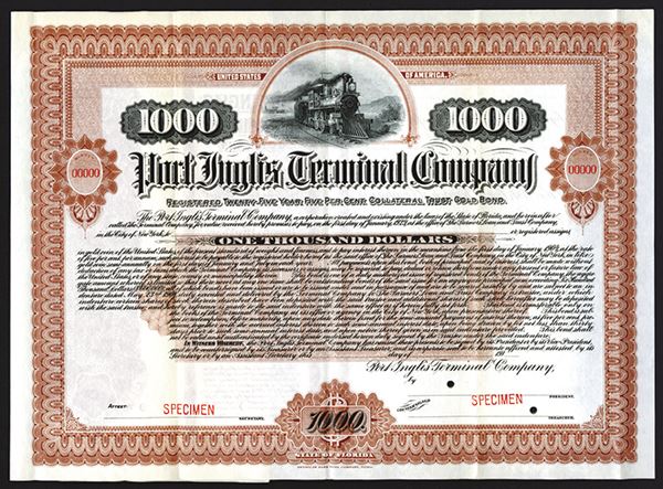 Florida, 1904, $1000 25 Year 5% Gold Specimen Bond, Black printing with red border and underprint, Moving locomotive top center, POC's and red SPECIMEN overprints, VF-XF condition, ABNC. This is the same bond pictured in Cox that came from one of our 2012-13 auctions with only 2 known to exist.
