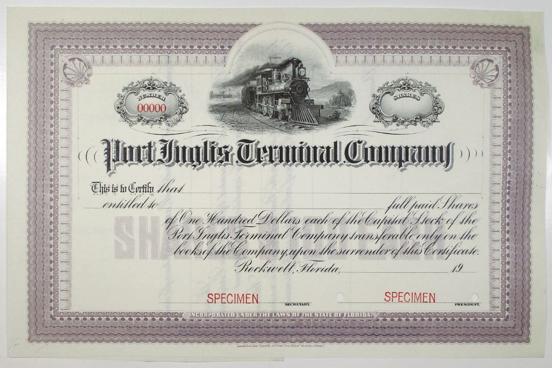 Florida, 1904. Odd Shares Specimen Capital Stock Certificate, Black text with purple border and underprint, Train approaching on tracks at top center. Red specimen overprints, 00000 serial number, and POCs. VF condition, ABNC. Rare and only known as a specimen in Cox, no issued examples known.
