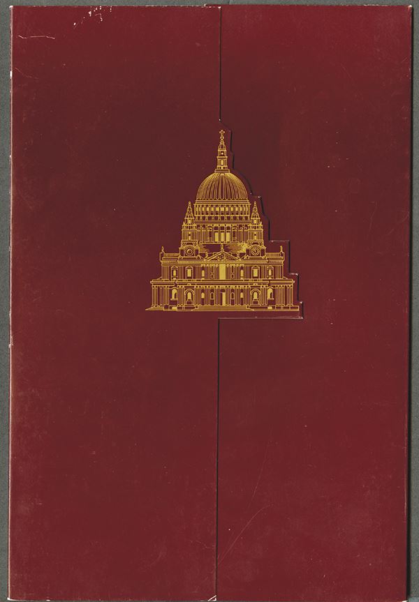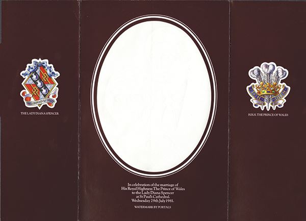 Great Britain. Portals Commemorative Watermark portrait of Prince Charles and Lady Diana (oval 7-3/4 x 6- inches) set into bi-fold brick red card presentation folder. The watermark is visible when the folder is opened, and thru the back of the folder. Portals is a division of De La Rue International Ltd. Folder is 11-3/4x8-1/4 when closed.