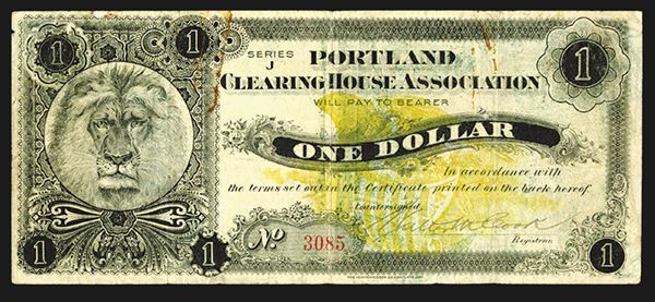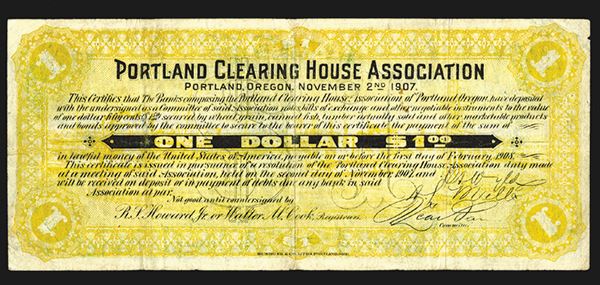 Portland, Oregon. November 2nd, 1907. $1. Series J. Issued and uncancelled bank or scrip note. Black on light yellow underprint with impressive lion on left, back is black on light yellow with text and facsimile signatures of the committee members. Fine + condition. Scarce Oregon scrip note and one of the few 1907 panic notes known from Oregon.