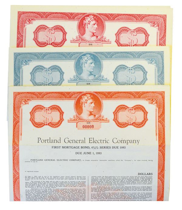 Oregon. Lot of 4 Specimen Bonds. 1) $-Odd Amount Specimen 4 3/4% Registered 1st Mortgage Bond, Black print on orange border and under tint, Portrait of Ancient Roman man at top. 2) $-Odd Amount Specimen 4 3/4% Registered 1st Mortgage Bond, Black print on teal blue border and under tint, Portrait of Ancient Roman man at top. 3) $-Odd Amount Specimen 4.70% Registered 1st Mortgage Bond, Black print on red border and under tint, Portrait of Ancient Roman man at top. 4) $-Odd Amount Specimen 4 5/8% Registered 1st Mortgage Bond, Black print on green border and under tint, Portrait of Ancient Roman man at top. All have Specimen overprints and POC's and are VF-XF condition, ABNC.