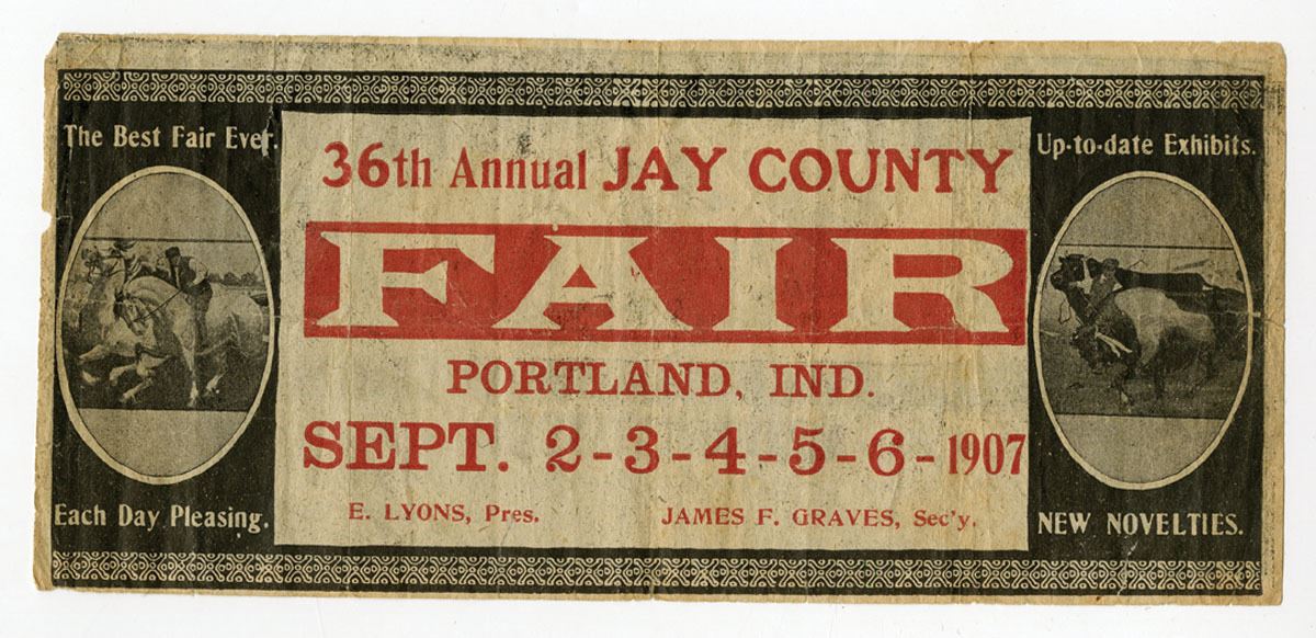 Portland, Indiana, 1907, Advertising note. "36th Annual JAY COUNTY FAIR". Black and red with bulls on right and men horse racing on left, printed on back of a $20 1864 Facsimile Confederate note, Fine to Choice Fine condition. Scarce Indiana advertising banknote.