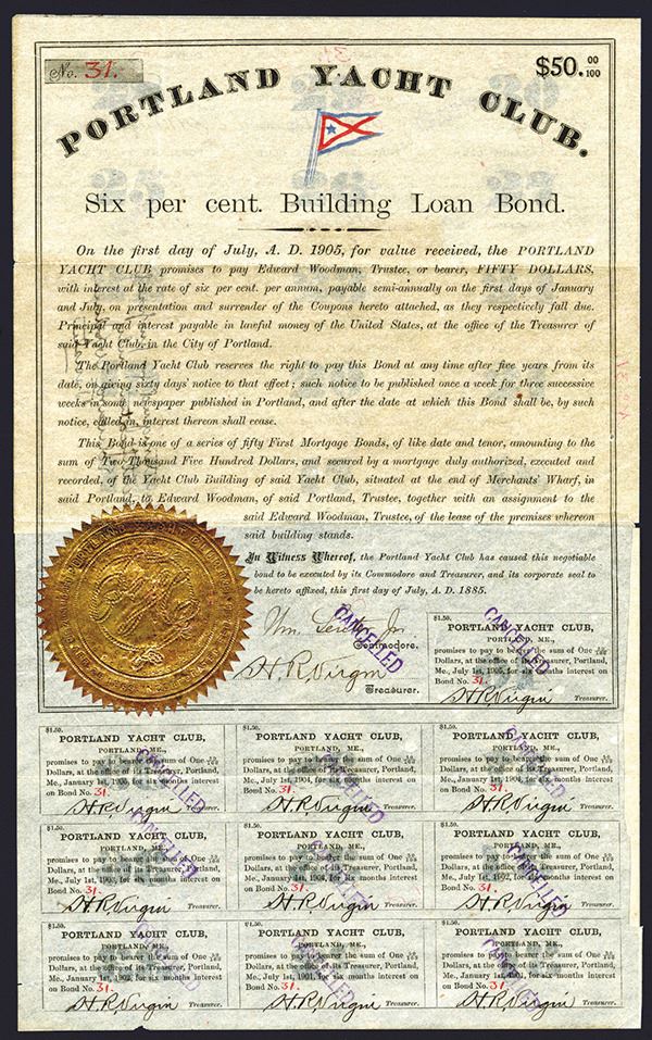 Oregon, 1885, $50, 6% Issued Bond, Portland Yacht Club flag top center with large gold seal bottom left, VF condition with coupons attached.