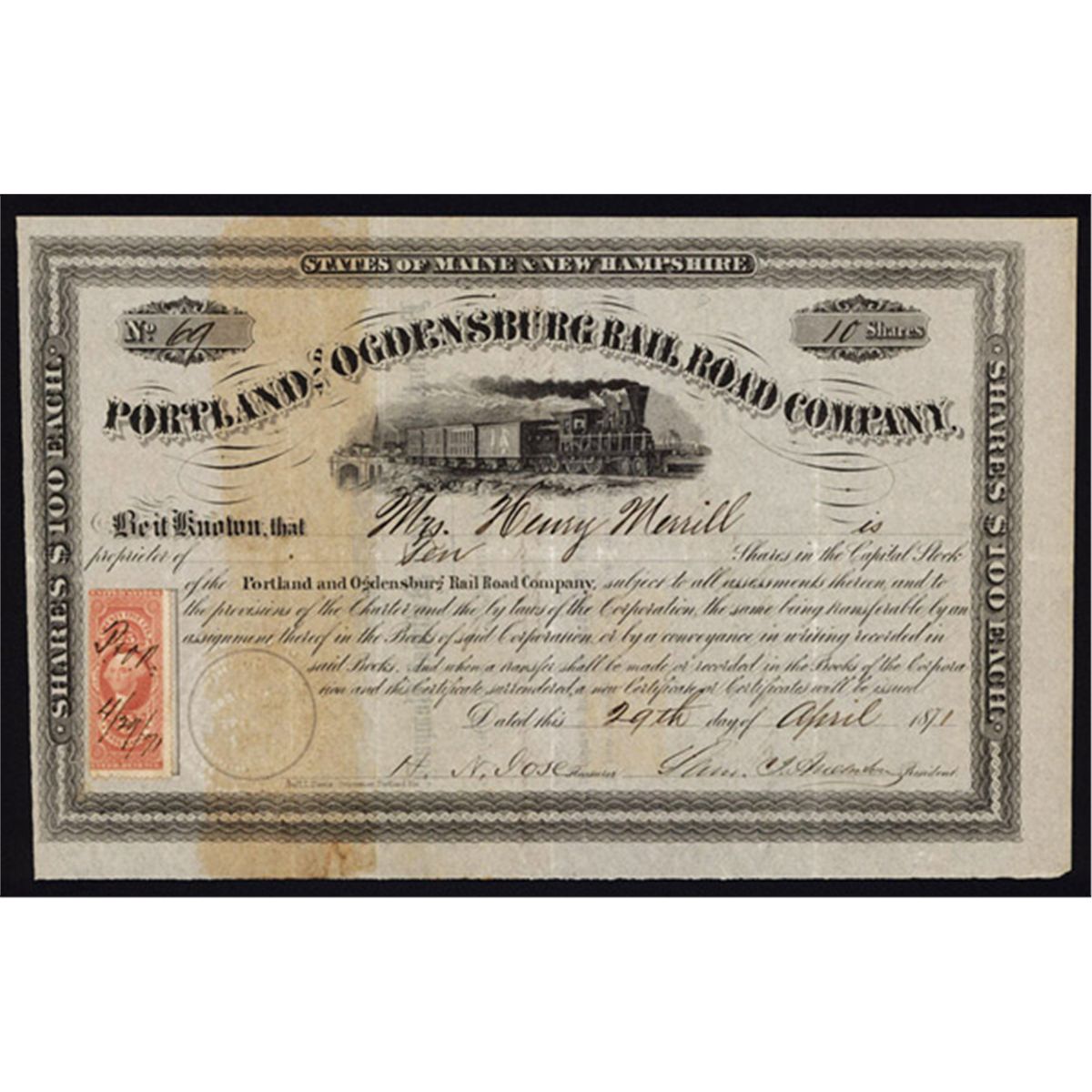 Maine and New Hampshire, 1871, 10 shs., Issued and endorsed on back Stock certificate, black border, locomotive L/R, company seal, revenue stamp attached, Appears VF to XF but there is a glue stain on the left 1/3rd of the stock that is on the back but shows through the paper.