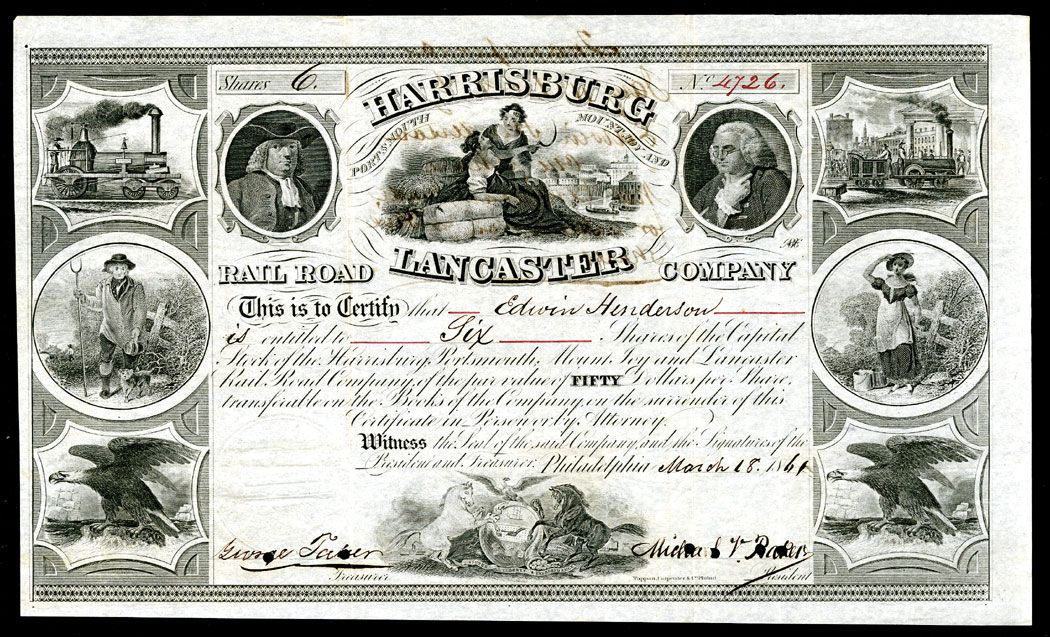 Philadelphia, Pennsylvania, 1861, 6 Shares, I/C, Impressive multiple vignetted certificate with seated allegorical woman in middle flanked by Franklin and Penn with locomotives, eagles and allegorical women on left and right, XF, Classic railroad stock certificate. TC&C.