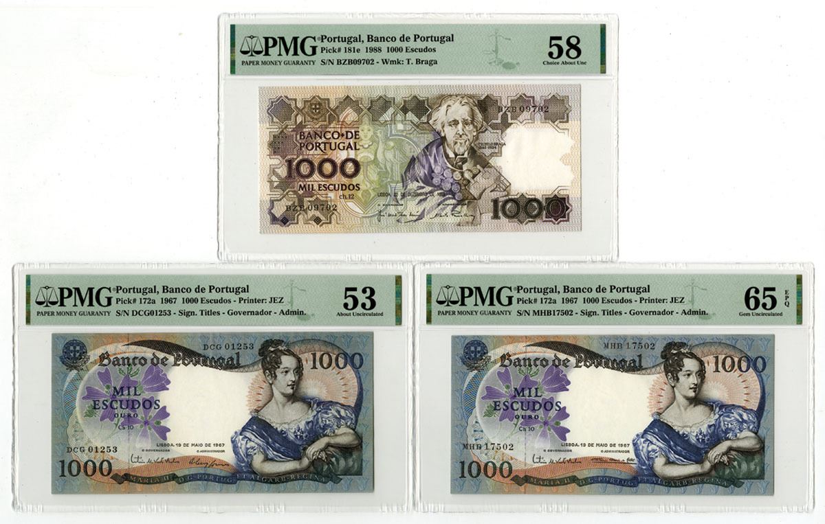 Portugal, 1967-88. Lot of 3 Issued Banknotes, Includes: 1967, 1000 Escudos, P-172a (2), Blue on m/c underprint with Queen Maria at right, S/Ns DCG01253 & MHB17502, Both are PMG graded, First is About Unc 53 and other is Gem Unc 65 EPQ; 1988, 1000 Escudos, P-181e, Brown on m/c with Braga at right, S/N BZB09702, PMG graded Choice About Unc 58. (3). Sold "AS IS" no returns accepted.