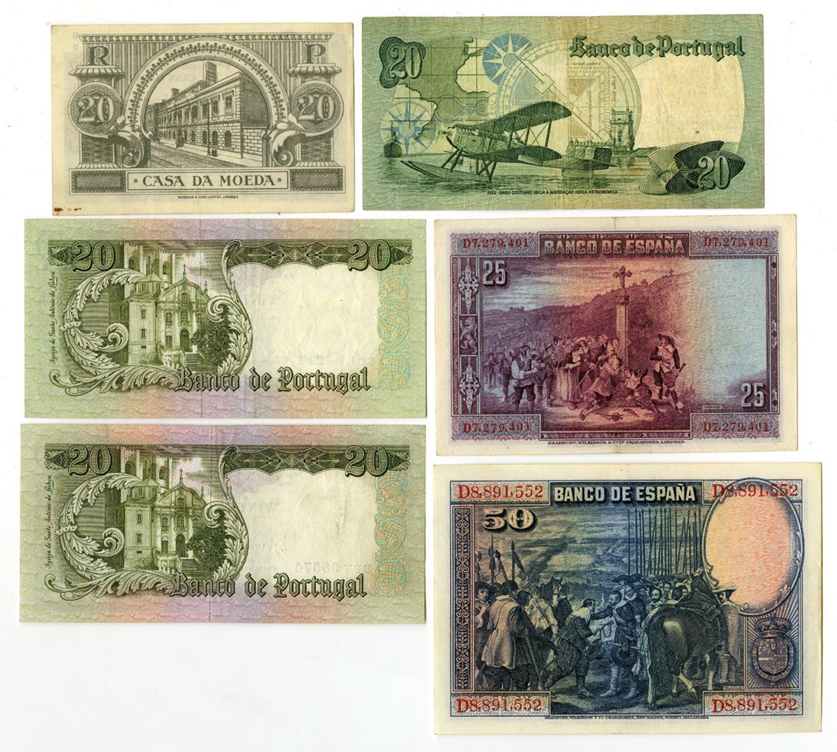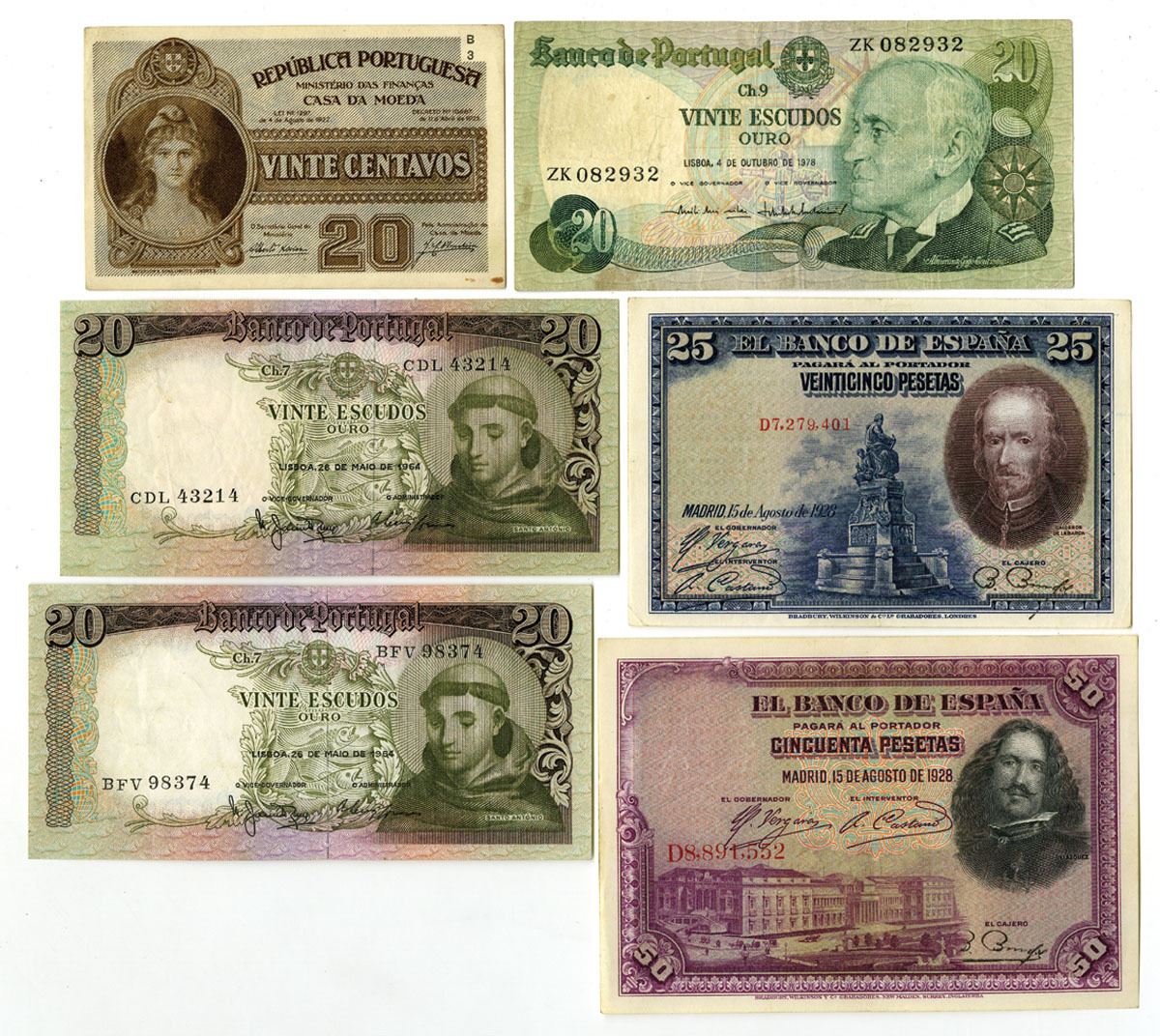 Portugal & Spain, D.1920 to 1978. Lot of 6 Issued Banknotes, Includes: D.1922, Casa da Moeda, 20 Centavos, P-102, W& S; Banco de Portugal, 1964, 20 Escudos, P-167b (2); 1978, 20 Escudos, P-176b; 1928, Banco de Espana, 25 Pesetas, P-74a; 50 Pesetas, P-75c. Notes range from VF to XF+ condition. (6). Sold "AS IS" no returns accepted.