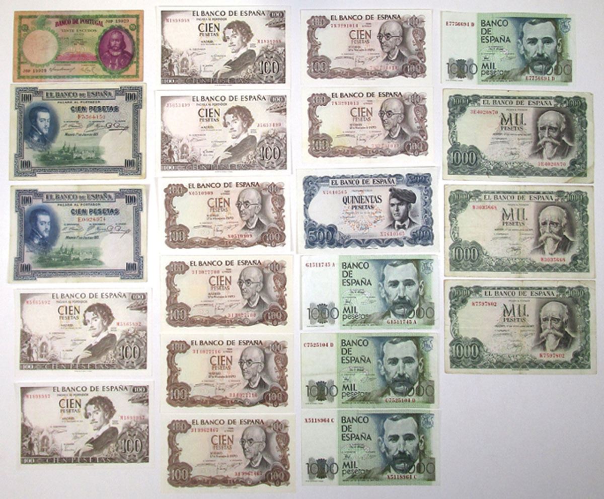 Portugal and Spain, 1925 to 1979. Lot of 20+ Issued Banknotes, Includes: 1948, Banco de Portugal, 20 Escudos, P-153a, BWC; 1925, Bank of Spain, 100 Pesetas, P-69c (2), BWC; 1965 (1970), 100 Pesetas, P-150 (4), FNMT; 1970 (1974), 100 Pesetas, P-152a (6), FNMT; 1971 (1973), 500 Pesetas, P-153a, FNMT; 1971 (1974), 1000 Pesetas, P-154 (3), FNMT; 1979 (1982), 1000 Pesetas, P-158 (4), FNMT. Notes range from Fine to AU condition. (21). Sold "AS IS" no returns accepted.