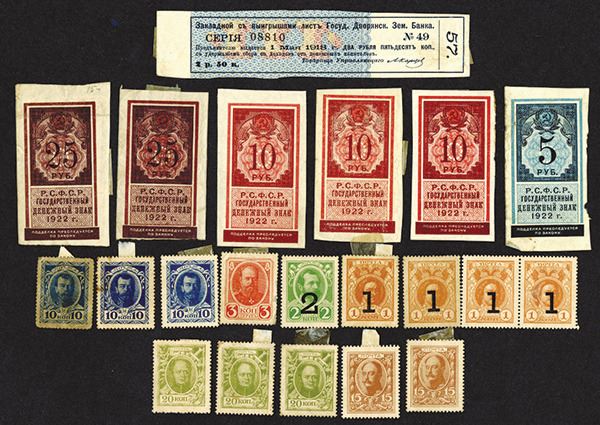 Russia. Postage Stamp Currency, 1, 3, 10, 15, 20 Kopeks. P-16 to 23. Most hinged. (14); Interest Payment Coupon, 2.5 Ruble. 1918. Government Bank of Nobility Land; RSFSR. 1922 Government Monetary Token. 5, 10, 25 Rubles. P-148, 149 (3), 150 (2). Many with hinges. Very Fine. 21 pieces total. (The Pogrebetsky Family Archives)