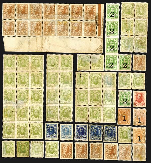 Russia. Includes: 1, 2, 3, 10, 15, 20 Kopek issues. SCWPM 18 (6), 20, 21 (5), 22 (22), 23 (47), 32a (3). Some with mildew stains and other issues. Some attached as sheets of stamps. 84 pieces total.