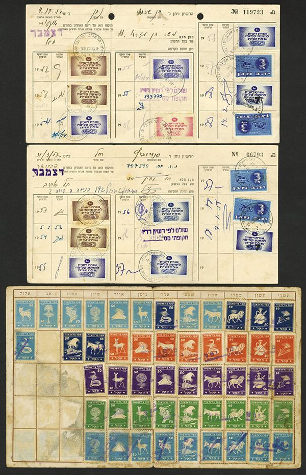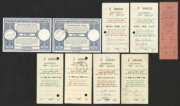 Palestine Post Office related collection, comprising; various counterfoils for Orders of varying denomination (6); two International reply coupons for 25 mils, both 1947; Palestine Savings Certificates, an unused saving stamp card, 1943 printing; and Israeli saving stamp cards from the early 1950's through to early 1960's (4), mixed condition but most are very fine and better. (14)