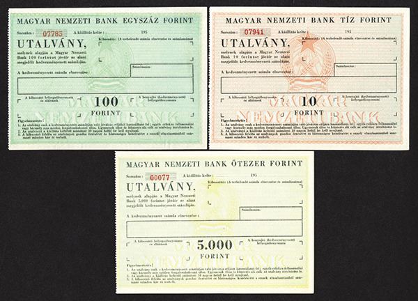 Hungary. 10, 100, 5000 Forint Postal Notes. Unused. The last with low serial # 00077. Uncirculated. 3 pieces.