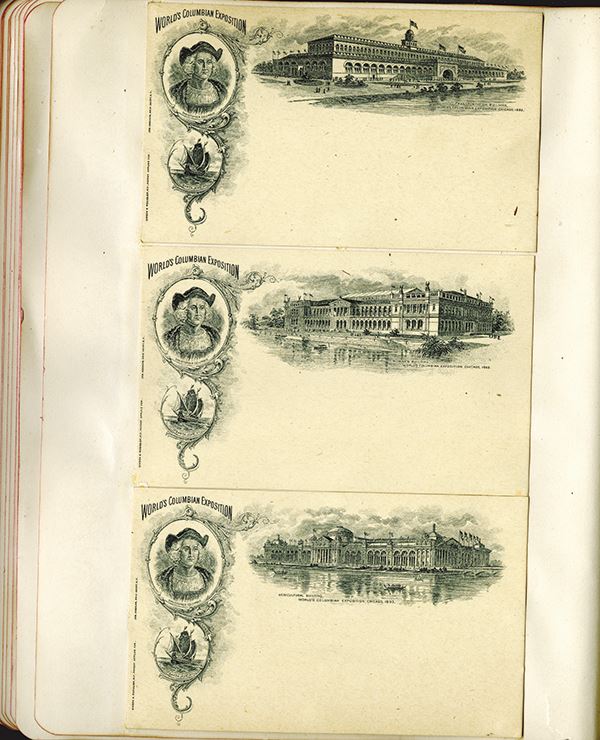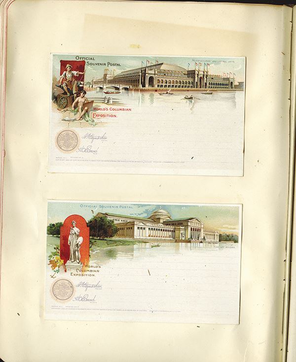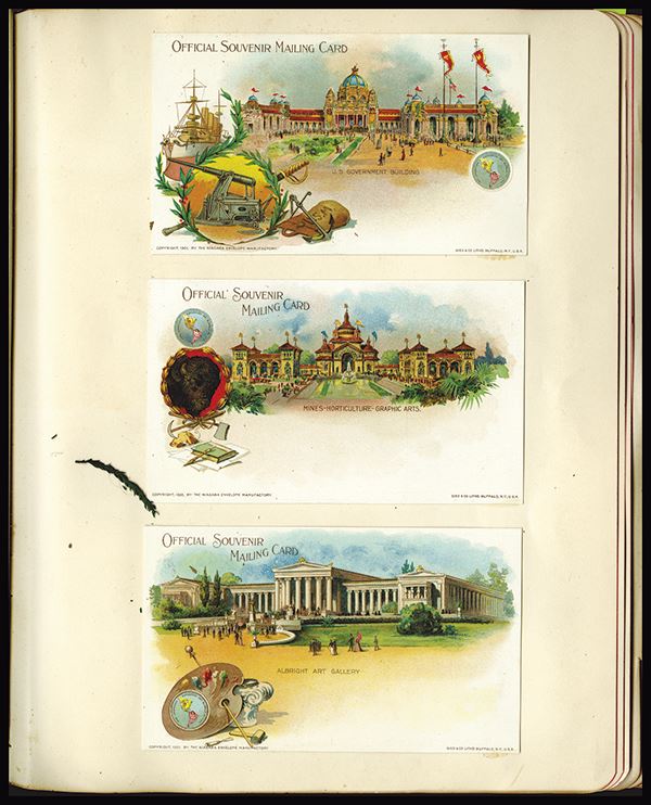 Sample Book of postcards received by or collected by Ernest G. Laubenheimer. Mounted three to a page on most pages, both sides of the page. New Year themes as well as births; scenes of NJ and NH; Official card set of the World's Columbian Exposition, Chicago, 1893 (color and B&W set) and the Pan-American Exposition, Buffalo, 1901; 60 pages, over 150 cards. Most postally used but for the three exposition sets. All have been glue mounted onto the page.