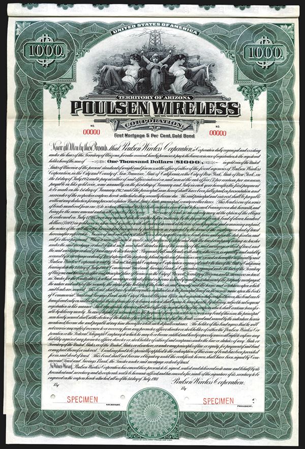 AZ. $1000, Specimen 5% Gold Coupon Bond, Black on green border, Allegorical women flank young girl holding torches, Specimen overprints, POC's, VF, ABNC. Early Wireless radio or telephone company.