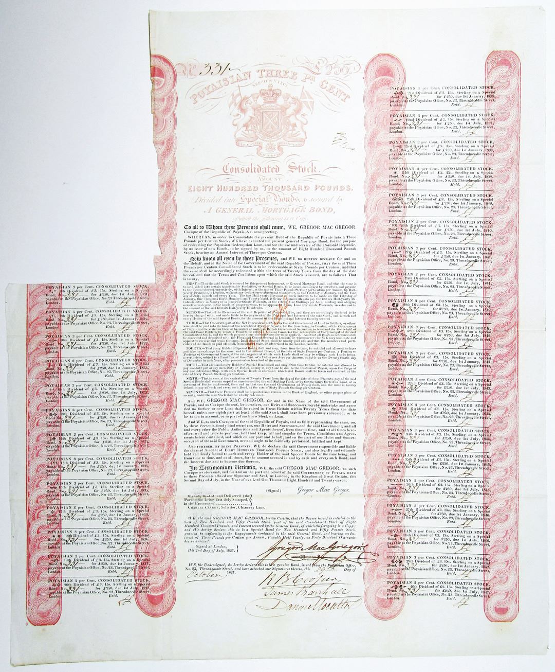 Mosquito Territory (Honduras), 1827, £250 Pounds Issued and uncancelled 3% Consolidated Stock with Coupons, signed by Gregor MacGregor, S/N 331. Black text with elaborate coat of arms depicted in pink at top, featuring English and Scottish flags, with pink borders throughout. VF condition with slight toning and small holes along fold lines, some repaired. Still in great condition for its age. General Gregor MacGregor (24 December 1786 to 4 December 1845) was a Scottish soldier, adventurer, and confidence trickster who attempted from 1821 to 1837 to draw British and French investors and settlers to "Poyais", a fictional Central American territory that he claimed to rule as "Cazique". Hundreds invested their savings in supposed Poyaisian government bonds and land certificates, while about 250 emigrated to MacGregor's invented country in 1822Ð23 to find only an untouched jungle; more than half of them died. MacGregor's Poyais scheme has been called one of the most brazen confidence tricks in history. He devised a tricameral parliament and other convoluted constitutional arrangements for Poyais, drew up commercial and banking mechanisms, and designed distinctive uniforms for each regiment of the Poyaisian Army. His imaginary country had an honours system, landed titles, as well as a coat of arms. A French court tried MacGregor and three others for fraud in 1826 after he attempted a variation on the scheme there, but convicted only one of his associates. Acquitted, MacGregor attempted lesser Poyais schemes in London over the next decade. In 1838, he moved to Venezuela, where he was welcomed back as a hero. He died in Caracas in 1845, aged 58, and was buried with full military honors in Caracas Cathedral. This piece is directly related to MacGregor's scam, and is a fascinating document from a famous con man. Very Rare. ( John E. Herzog Collection)