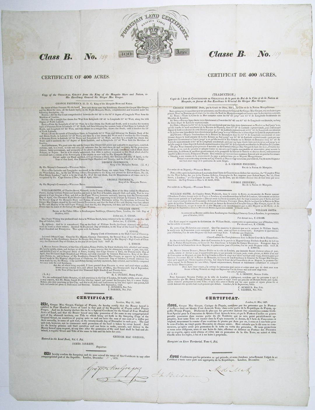 Mosquito Territory (Honduras), 1830 I/U Poyaisian Land Certificate, Class B Land Grant for 400 Acres, S/N 159 signed by Gregor MacGregor. Black text in English and French, with elaborate coat of arms depicted at top center, featuring English and Scottish flags, faint watermarks at top. Fine condition with some toning, splitting, and holes along fold lines. General Gregor MacGregor (24 December 1786 to 4 December 1845) was a Scottish soldier, adventurer, and confidence trickster who attempted from 1821 to 1837 to draw British and French investors and settlers to "Poyais", a fictional Central American territory that he claimed to rule as "Cazique". Hundreds invested their savings in supposed Poyaisian government bonds and land certificates, while about 250 emigrated to MacGregor's invented country in 1822Ð23 to find only an untouched jungle; more than half of them died. MacGregor's Poyais scheme has been called one of the most brazen confidence tricks in history. He devised a tricameral parliament and other convoluted constitutional arrangements for Poyais, drew up commercial and banking mechanisms, and designed distinctive uniforms for each regiment of the Poyaisian Army. His imaginary country had an honours system, landed titles, as well as a coat of arms. A French court tried MacGregor and three others for fraud in 1826 after he attempted a variation on the scheme there, but convicted only one of his associates. Acquitted, MacGregor attempted lesser Poyais schemes in London over the next decade. In 1838, he moved to Venezuela, where he was welcomed back as a hero. He died in Caracas in 1845, aged 58, and was buried with full military honors in Caracas Cathedral. Fascinating piece of history from a famous con man. (John E. Herzog Collection)