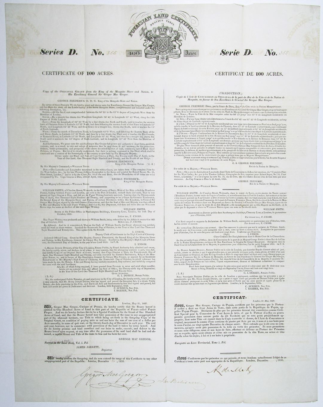 Mosquito Territory (Honduras), 1830 I/U Poyaisian Land Certificate, Series D Land Grant for 100 Acres, S/N 355 signed by Sir Gregor MacGregor. Black text in English and French, with elaborate coat of arms depicted at top center, featuring English and Scottish flags, also in faint watermarks at top. Fine-VF condition with very slight toning along fold lines. General Gregor MacGregor (24 December 1786 to 4 December 1845) was a Scottish soldier, adventurer, and confidence trickster who attempted from 1821 to 1837 to draw British and French investors and settlers to "Poyais", a fictional Central American territory that he claimed to rule as "Cazique". Hundreds invested their savings in supposed Poyaisian government bonds and land certificates, while about 250 emigrated to MacGregor's invented country in 1822Ð23 to find only an untouched jungle; more than half of them died. MacGregor's Poyais scheme has been called one of the most brazen confidence tricks in history. He devised a tricameral parliament and other convoluted constitutional arrangements for Poyais, drew up commercial and banking mechanisms, and designed distinctive uniforms for each regiment of the Poyaisian Army. His imaginary country had an honours system, landed titles, as well as a coat of arms. A French court tried MacGregor and three others for fraud in 1826 after he attempted a variation on the scheme there, but convicted only one of his associates. Acquitted, MacGregor attempted lesser Poyais schemes in London over the next decade. In 1838, he moved to Venezuela, where he was welcomed back as a hero. He died in Caracas in 1845, aged 58, and was buried with full military honors in Caracas Cathedral. Rare piece of history from an infamous scheme and con man. (John E. Herzog Collection)