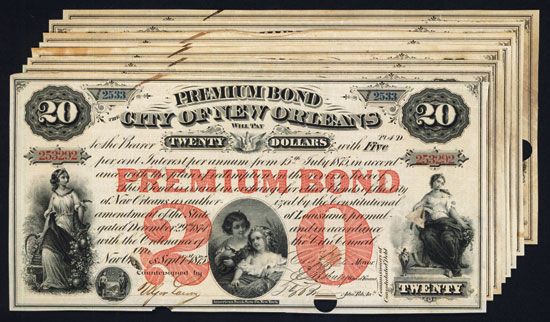 New Orleans, Louisiana, 1875, Group of 8, $20, 5%, 50 year bonds, vignettes of allegorical females, two young girls and New Orleans seal, usual mixed condition, VF to AU condition group, ABNC.