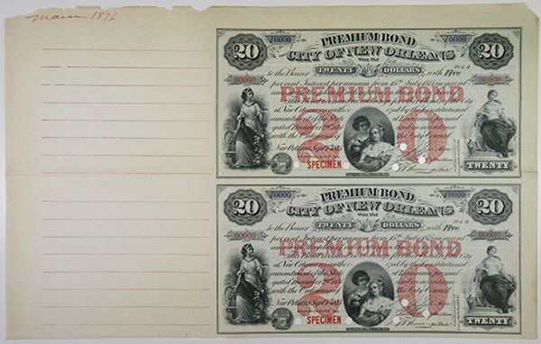 New Orleans, Louisiana. $20 Series 1875 Bond. Uncut sheet of 2 bonds with counterfoil on left, allegorical reaper at left, young girls bottom middle and seated woman at right, red "Premium Bond 20" protector in middle, Specimen overprints, POC's, and S/N 00009, back with plkan of redemption from 1876 to 1925, AU condition with light toning on the top margin, horizontal fold in middle and handwritten in red ink on the upper eft corner of the counterfoil "March 1876". ABNC. Only one sheet of 4 was found in 2002, this is the top 1/2, the bottom is not available.
