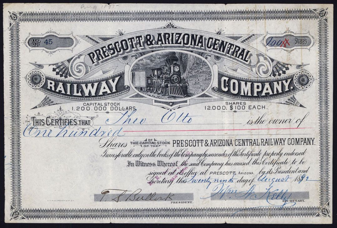 Prescott, Arizona, 1892. 100 Shares, Issued and uncancelled but endorsed and transferred on back, black with no underprint, locomotive L-R passing trees under arched title, Shares $100 each, Issued to Theo Otto and signed by T.S. Bullock as president. The Prescott & Arizona Central was built by a group formed by Thomas S. Bullock and in 1886 they completed a 73 mile line from a connection with the Atlantic & Pacific at Seligman to Prescott. In 1893 the Prescott & Arizona Central was bankrupt and in receivership. Rare western railroad stock certificate.