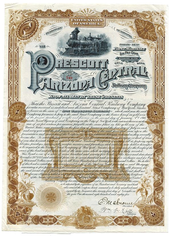 Territory of Arizona. 1885, $1000 I/U, 30 Year, 1st Mortgage 6% Gold Coupon Bond, Black on brown border and undertint, Locomotive at top over ornate title and ornate border design, VF condition. Homer Lee BNC. Rare and attractive early western railroad bond.