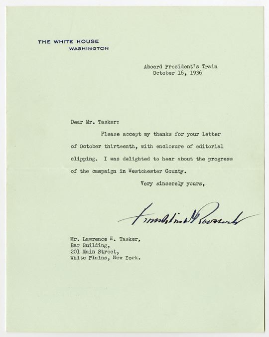 Washington, D.C., 1936. Typewritten letter from "Aboard President's Train" with "The White House, Washington" letterhead, from and signed by President Franklin D. Roosevelt. The letter is addressed to Lawrence H. Tasker, and thanks him for his October 13th letter with an "editorial clipping." Roosevelt states that he was "delighted to hear about the progress of the campaign in Westchester County." The letter is signed by Roosevelt at center right with his distinctive signature. Franklin Delano Roosevelt January 30, 1882 - April 12, 1945), often referred to by his initials FDR, was an American politician and attorney who served as the 32nd president of the United States from 1933 until his death in 1945. As a member of the Democratic Party, he won a record four presidential elections and became a central figure in world events during the first half of the 20th century. Roosevelt directed the federal government during most of the Great Depression, implementing his New Deal domestic agenda in response to the worst economic crisis in U.S. history. As a dominant leader of his party, he built the New Deal Coalition, which defined modern liberalism in the United States throughout the middle third of the 20th century. His third and fourth terms were dominated by World War II, which ended shortly after he died in office. VF condition. Great piece from a major American political figure and American president.