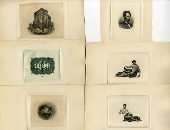 ca.1880-1920, Lot of 6 Vignettes Used on Obsolete Banknotes, Stocks, bonds, and checks depicting buildings, cattle, allegorical figures, and even Abraham Lincoln. ABN LDP Proof Vignettes are printed on India paper and mounted on cardstock. These are authentic proof vignettes from the American Bank Note Archives which was dispersed through auctions and private sales between 1988 and 2005. It is an extremely rare intaglio proof vignette printed on India paper from the original plates in very limited quantities by ABNC. The vignettes were used for U.S. and Worldwide Obsolete banknotes, stock and bond certificates, checks, drafts and other fiscal issues. ABNC printed extra vignette proofs for use in future designs as well as for samples for their records. Most of them are known with very few impressions as vignettes (between 1 and 20 total, mostly in the 5 or 10 total printed category). Predecessor printers such as Rawdon, Wright, Hatch & Co.; National Bank Note Co.; Continental Bank Note Co., and others are represented. All were acquired by ABNC over the years and kept in their archives that were stored by ABN. This is a rare opportunity to collect a rare historical engraving by this amazing company. (6). Sold "AS IS" no returns accepted.