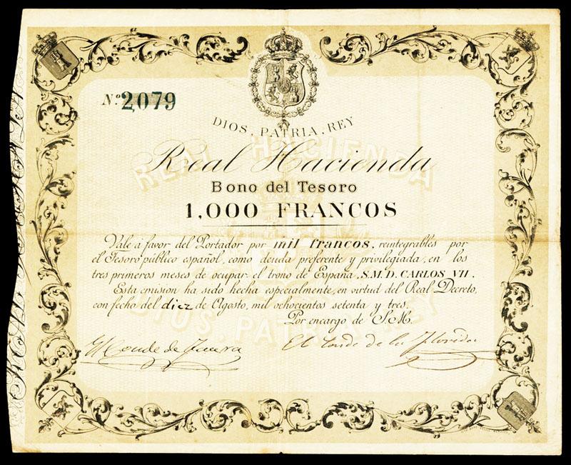 Pretenders Issue, 1873, Issued Carlos VII Bond.Spain,, 10 august 1873, 1000 Francos, P-Unlisted, Black on light brown, Crowned arms on top with ornate border over underprint with same crowned arms, S/N 2079, Carlist Bond, signed and issued. Extremely rare.