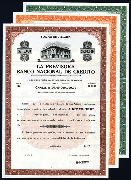 Ecuador, 19xx, 1000-5000-10000 Sucres, Specimen Bonds, Black on Green-Orange-Brown borders and underprint, Bank building top center, POC's and red SPECIMEN overprints, VF condition, ABNC.
