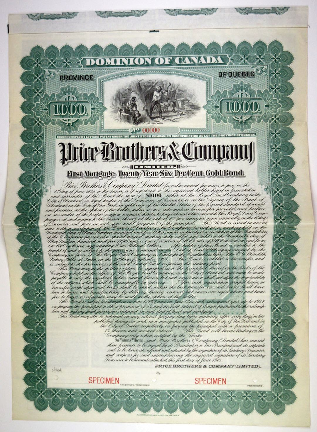 Canada, 1909. $1000 Specimen 6% 1st Mortgage Gold Coupon Bond, Black print on large green border and under tint, Men chopping down trees at top, Specimen overprints and POC's, Fine-VF condition with splitting along fold lines, ABNC.