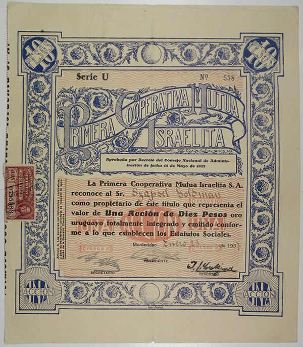Israel/Uruguay. 10 Peso Gold Shares I/U Series U Stock Certificate, Black print on blue border with red underprint with revenue stamp at left, Printed in Spanish, Ornate title at top, VF-XF condition. The New Jewish Congregation was founded in 1936 mostly by German and Austrian Jews who fled Nazism. It established two synagogues, the big one on Wilson Ferreira Aldunate Street is Conservative, the smaller one was Orthodox. (From the John E. Herzog Collection) (From the John E. Herzog Collection)