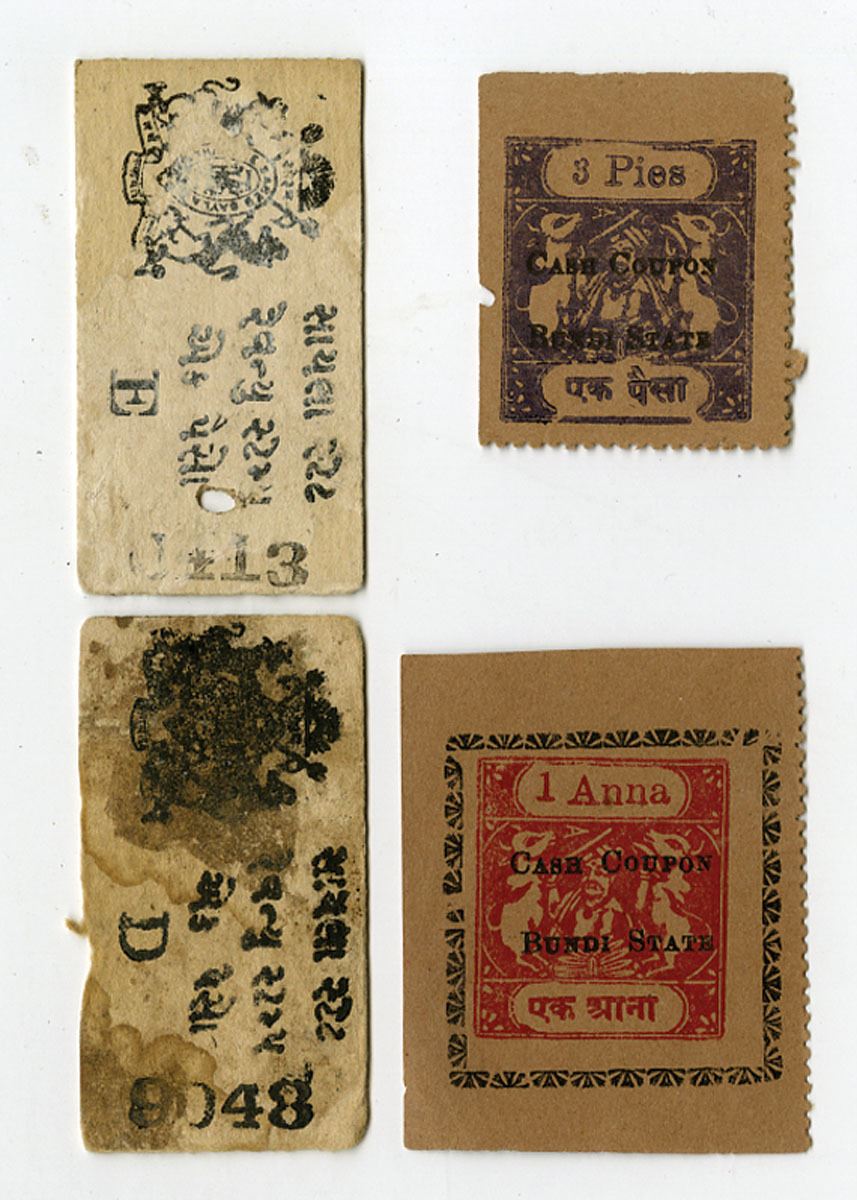 India, ND (1939-45). Lot of 4 Issued Scrip Coupon notes, Includes: Bundi Emergency Cash Coupon Stamp Money 3 Pies = 1 Paisa (Pice), P-S221; 1 Anna, P-S222; Sayala WWII Cash Coupon 1 Paisa (Pice), P-435 (2), Series D and Series E. Notes range from Fine to XF condition. (4). Sold "AS IS" no returns accepted.