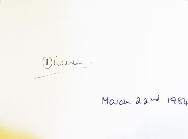 Signature Diana Ð dates March 22nd 1984. Taken from Page of East Midlands Airport VIP Book, that she signed on a visit in 1984. 8.5 by 12 inches Page. Diana, Princess of Wales, was a member of the British royal family as the first wife of Charles, Prince of Wales, who is the eldest child and heir apparent of Queen Elizabeth II. She was the mother of Prince William, Duke of Cambridge, and Prince Harry.