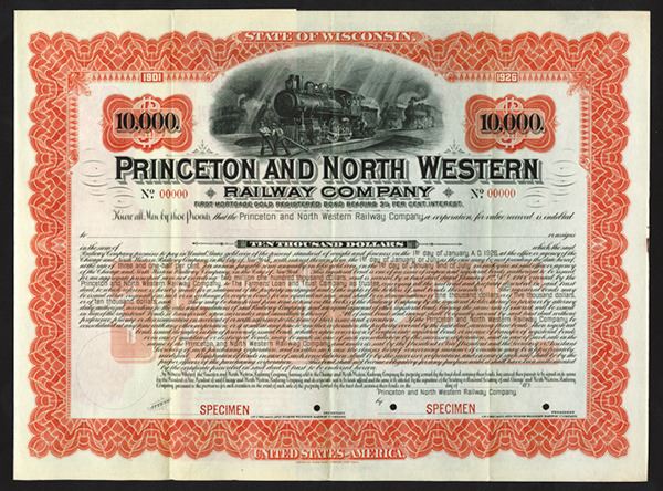 New Jersey. $10000 Specimen 3 1/2% 1st Mortgage Gold Registered Bond, Black print on orange border and under tint on horizontal format, Men turning engine on turntable at top, Specimen overprints and POC's, VF-XF condition, ABNC.