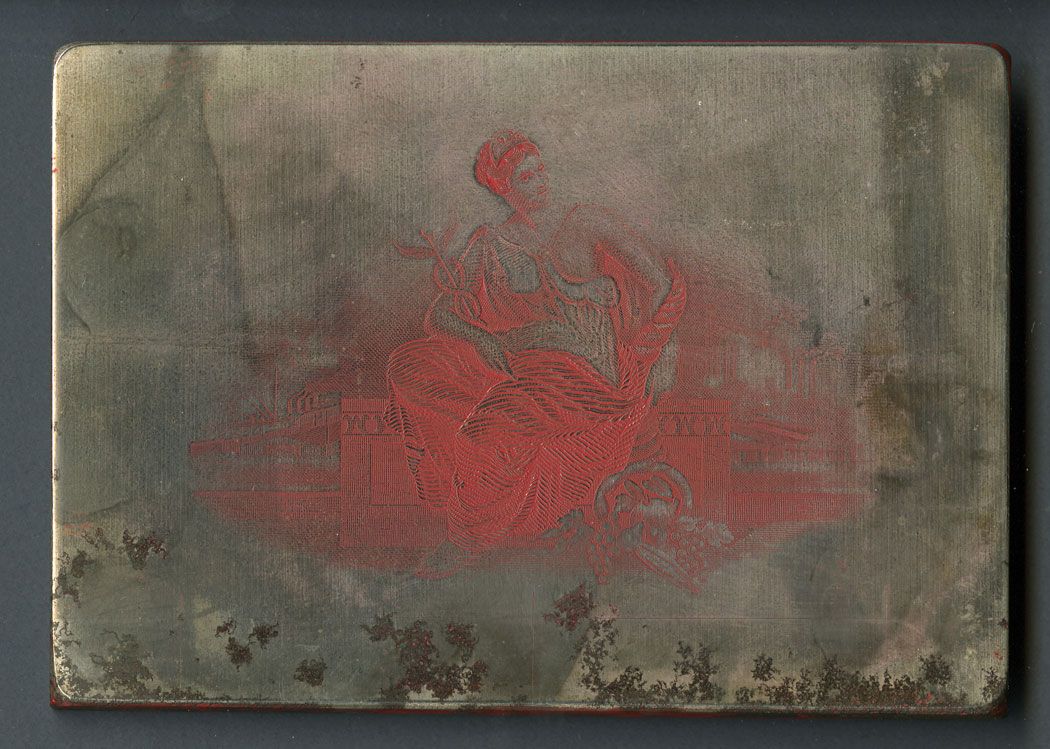ND (ca. 1920-40's), 4.5 x 3 inches, printed on steel, red ink still present in the intaglio recessed grooves, evidently from the last printing job. VF. Printer and engraver not specified.