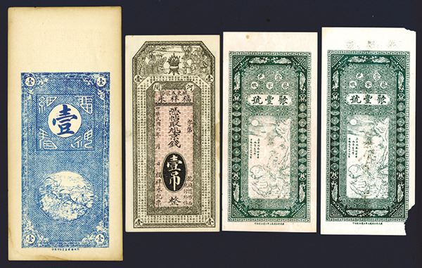 China. Chong Yang Area 2 Diao (2 one with paper loss); Fu Ziang Hao; Fu Cheng Tung 1000 Cash (stained). Generally Extremely Fine or better. 4 pieces.