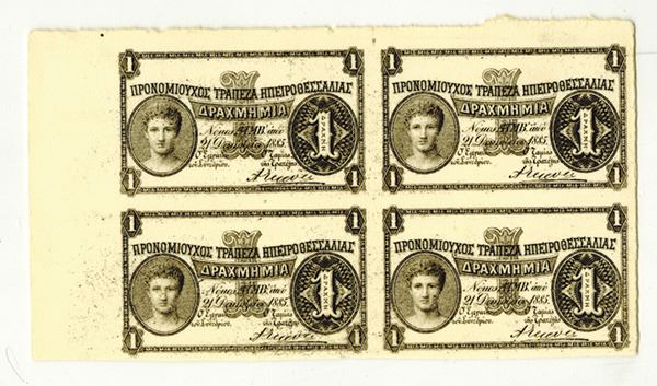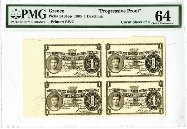 Greece, uniface uncut sheet of 4 progressive proof subjects of 1 Drachma, 1885, P-S104pp. PMG graded Choice Uncirculated 64. BWC.