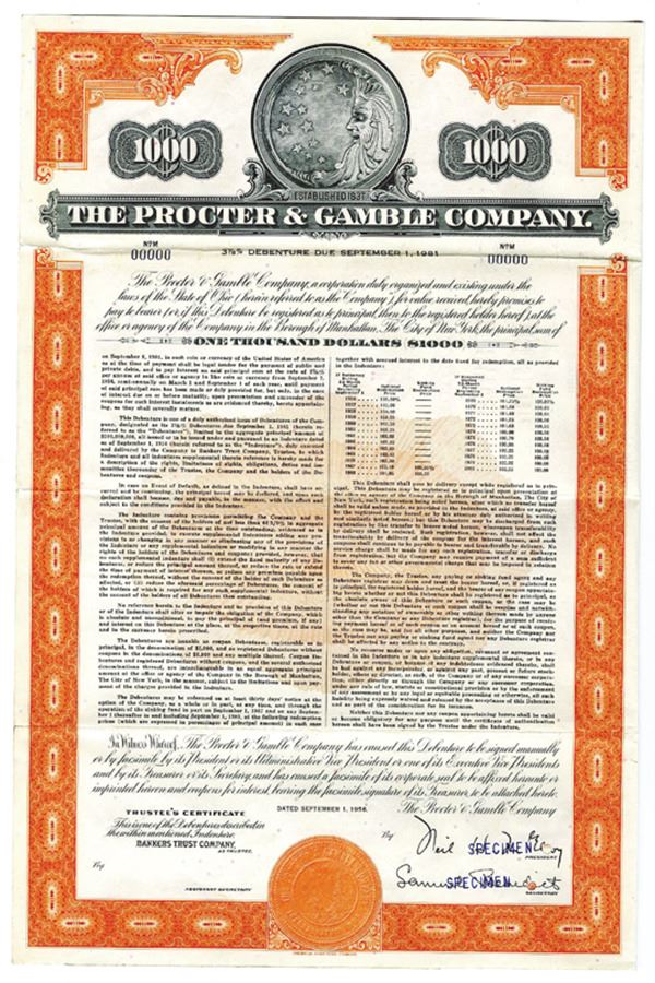Ohio. $1000 Specimen 3 7/8% Debenture Coupon Bond, Black print on orange border and under tint, Mans face on crescent moon at top, Specimen overprints and POC's, VF-XF condition, ABNC.