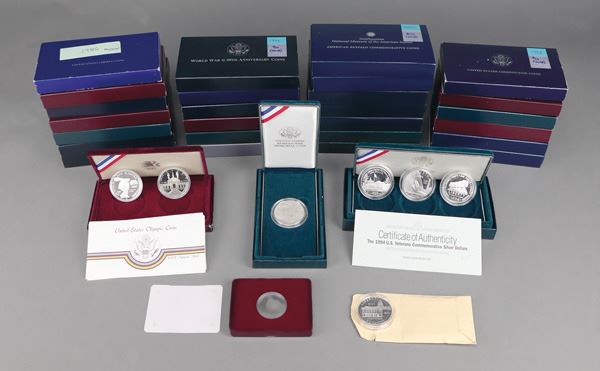 30 Commemorative Silver proof sets, all in original packaging except for the 2001 Capital Visitor Center Dollar. Highlights include the 1984 Olympic set of 2; 1997 National Law Enforcement; 1998 Black Revolutionary War Patriots; 2001 American Buffalo Commemorative Proof Dollar pair (2 sets); and many others including a 1982 50 Silver Washington proof. Valued over $1200 Greysheet (30). Shipping charges apply - weight 12 lbs. (photo on web site)