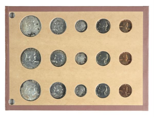 Also included is a partial type set of Barber quarters, V-Nickels and Flying Eagle Cents; a 1958 50 in BU; 1972 Eisenhower Dollar Proofs, a 1964 Uncirculated set, 14 modern non-silver proof sets from 1969 to 1994, 3 sets of 1986 Statue of Liberty Commemporative Silver Dollars and 50, and additional items. (90+ Coins). Shipping charges apply - weight 2 lbs. (photo on web site)