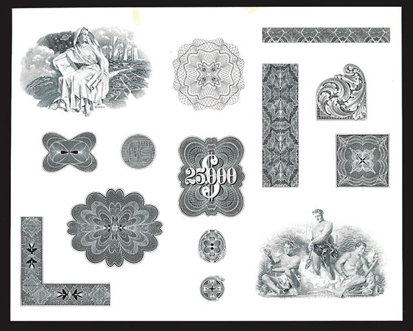 10 by 8 inches, black on coated stock, intaglio printed, 2 allegorical vignettes, counters, and ornate engraved borders. Uncirculated, USBN or ABNC.