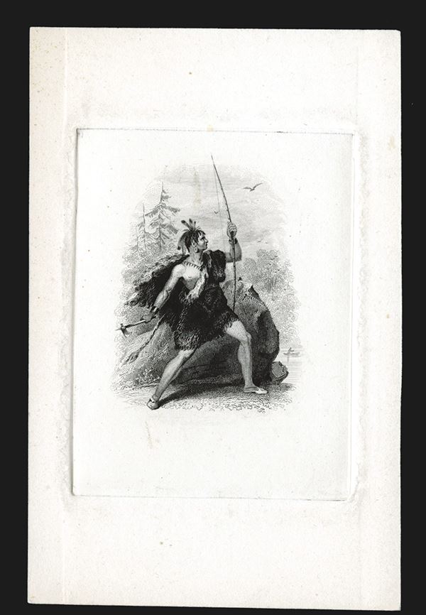 Indian brave with tomahawk and bow, wearing fur; canoeist in distance. Pencil notation on back: Bank of Red Wing MN, $5. Oct. 58. Deep die impress on card. 3-1/4x5-1/8. As made.