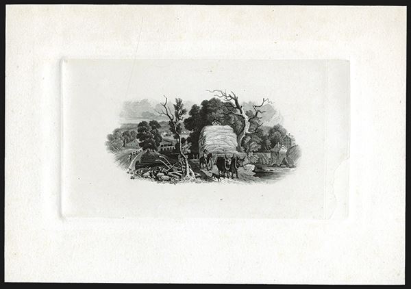 Wheat loaded on ox cart. Intaglio impression on paper on card. Penciled initials on back. As made.