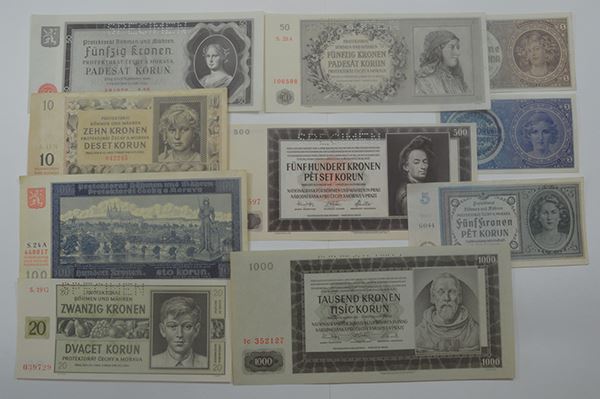 Bohemia & Moravia. Issued Notes: P-1a, 3a (2), 4a, 6a, 8a; Fine; Specimens perforated: 5s, 6s, 8s, 9s, 10s, 12s, 13s Generally Extremely Fine or better. 13 pieces.