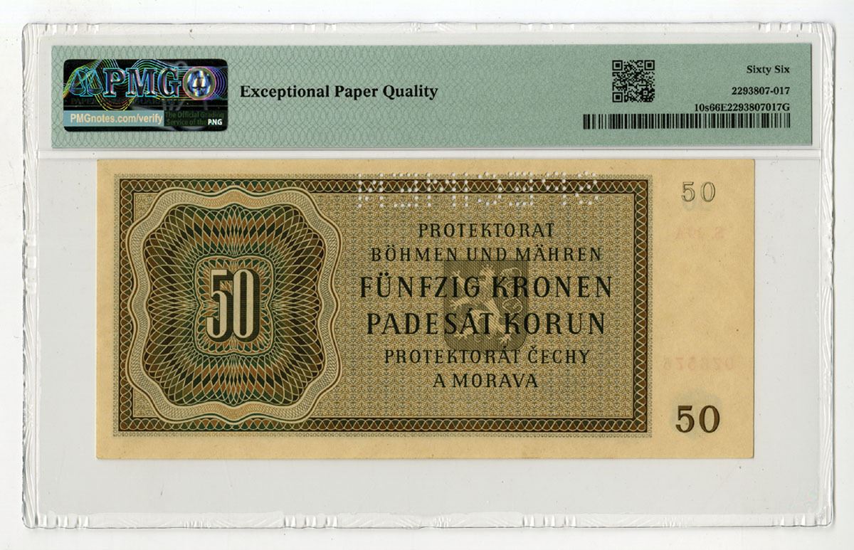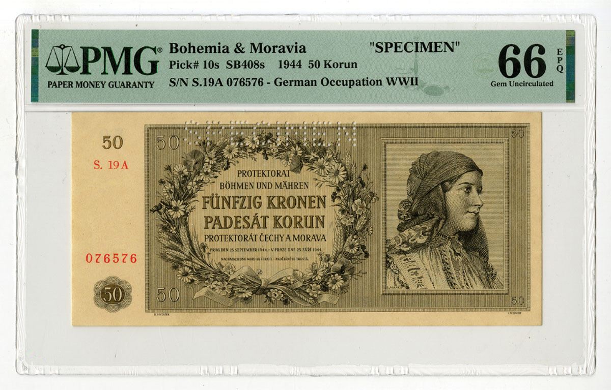 Bohemia & Moravia, 1944. 50 Korun, P-10s, SB408s, Specimen Banknote, Dark Brown on light beige underprint with young girl with scarf at right, Back is m/c with arms at right middle, Pin punched Specimen at top, S/N S.19A 076576, German Occupation WWII, PMG graded Gem Uncirculated 66 EPQ.