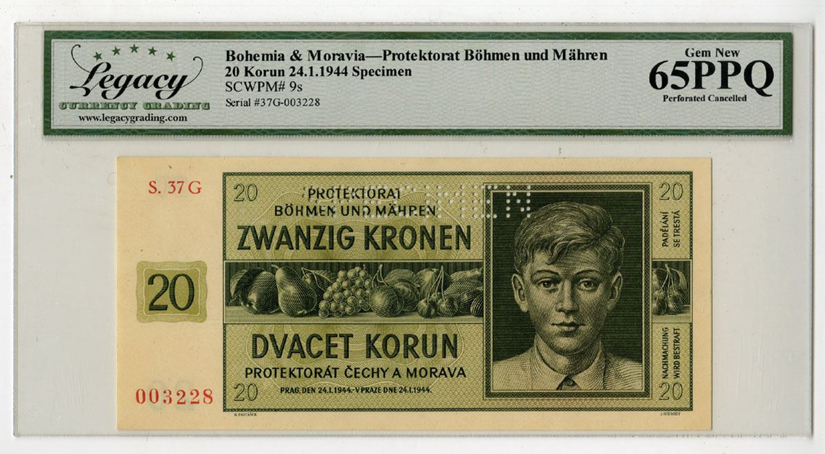 Bohemia & Moravia, 1944.. 20 Korun, P-9s, Specimen Banknote, Green on light green underprint, Fruit across center with portrait of a young boy at right, Back is green with arms in center as underprint, S/N 37G-003228, Legacy graded Gem New 65PPQ.