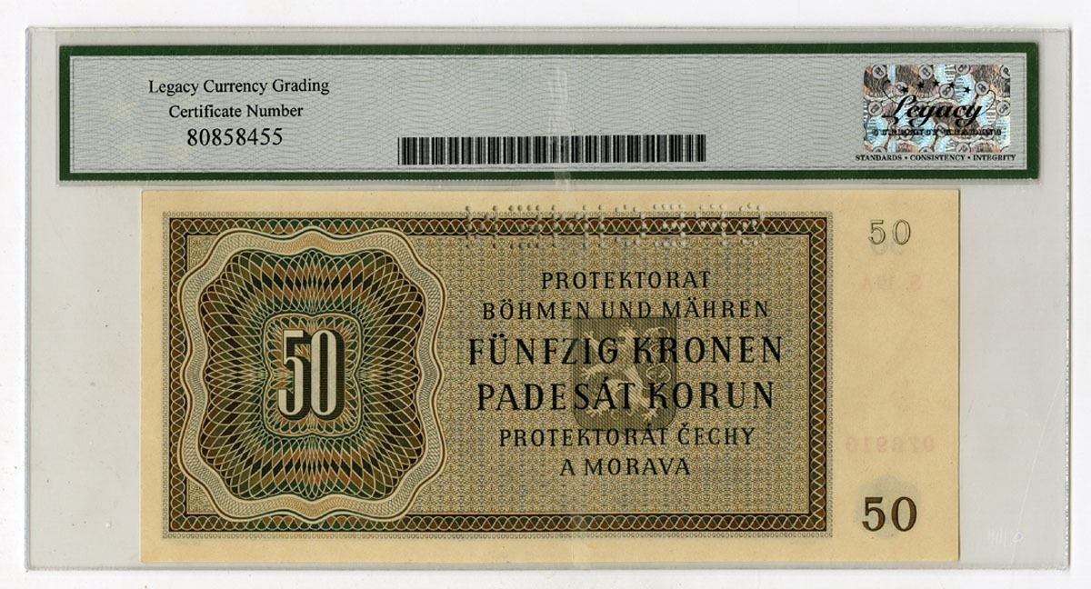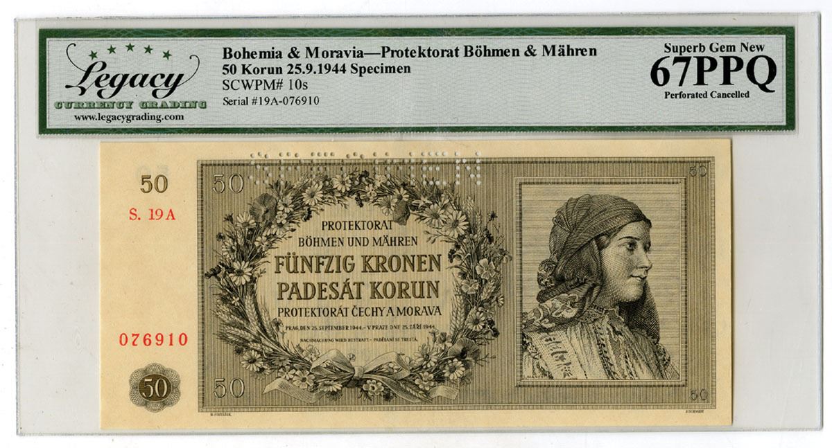 Bohemia & Moravia, 1944.. 50 Korun, P-10s, Specimen Banknote, Brownish gray with wreath at center and portrait of woman at right, Back is brown on m/c with arms at center in underprint, Pin punched Specimen at top, S/N 19A-076910, Legacy graded Superb Gem New 67PPQ. Tied with 3 others as highest graded out of 32 graded in the PMG census. This is the highest graded note has been offered at auction, none equal or higher.