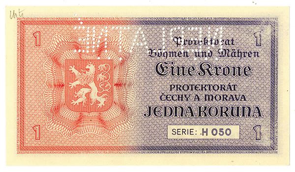 Bohemia & Moravia. Lot includes a specimen 1 Koruna note, perforated "NEPLATNE" (specimen), Series H 050. P-3s. Choice Unc, pencil annotation on back.