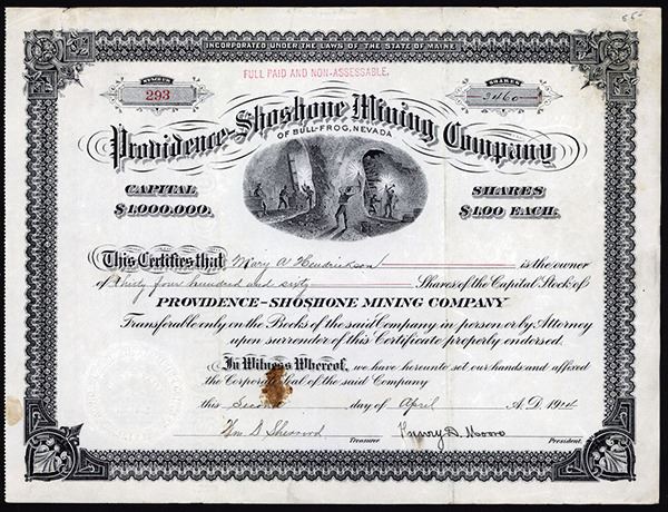 Bull-Frog, Nevada. (Inc. in Maine), 1914, I/U, 3460 Shares, #293, Black print with ornate black border and mining vignette in center, Fine condition with some creasing and small stain on bottom left area.
