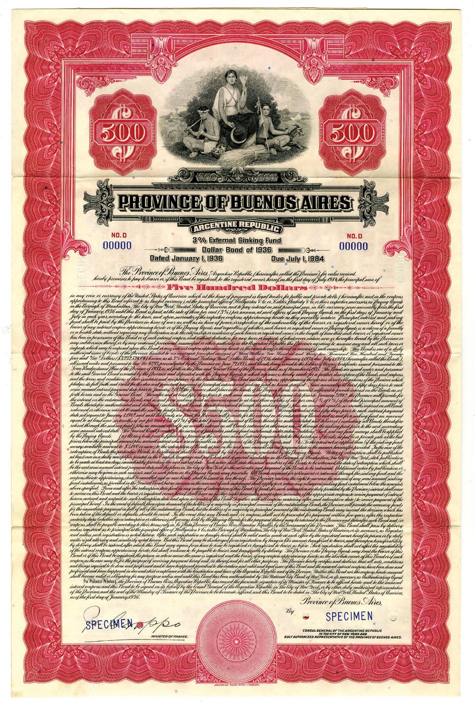 Buenos Aires, Argentina. $500 Specimen 3% External Sinking Fund Coupon Bond, Black print on pink border and under tint, Allegorical figures at top, Specimen overprints and POC's, Fine-VF condition, ABNC.